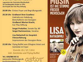 Begleitend zu ihrem Debütalbum ECHOES OF TIME (Deutsche Grammophon) hat Lisa Batiashvili beschlossen, sich für eine einzigartige Schule in ihrer Heimatstadt Tiflis einzusetzen, die die junge Geigerin wie fast jeder heute weltbekannte Musiker Georgiens selbst besuchte: Die Zentrale Musikschule für hochbegabte Kinder in Tiflis. Mit Unterstützung der Berliner Stiftung Fair Play und der renommierten Schauspielerin und Projekt-Schirmherrin Marion Kracht will die Künstlerin auf die untragbaren Bedingungen hinweisen, unter denen die Kinder seit der Zerstörung des ehemaligen Schulgebäudes durch ein verheerendes Erdbeben und die damaligen Kriegszustände zu leiden haben.